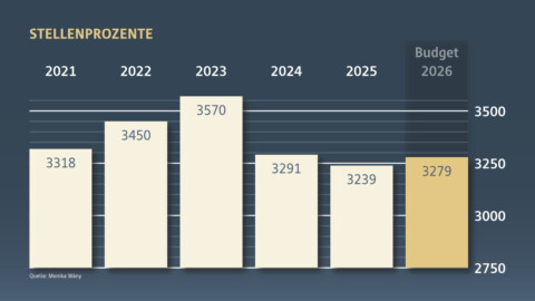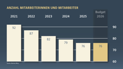 Die Zahl der Mitarbeitenden hat in den letzten Jahren etwas abgenommen, während die Stellenprozente leicht zugenommen haben (Zeitraum jeweils Dezember bis Ende November des Folgejahrs).
