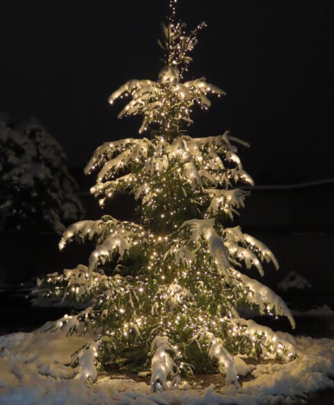 Christbaum auf dem Platz vor der Kirche St. Johannes in Buchs in einem weissen Winter. (Foto: Pfarrei Buchs-Rohr)