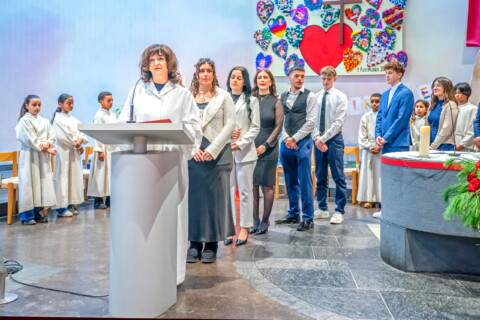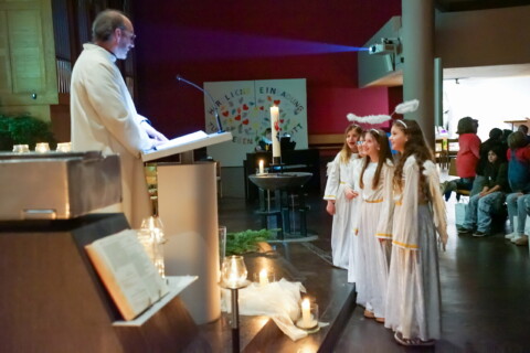 Die sehr gut besuchte Feier wurde von den Schülerinnen und Schülern der fünften Klasse mit Ana Behloul mitgestaltet. Die zahlreich anwesenden Mütter und Väter waren sehr stolz auf das besinnliche und souveräne Auftreten ihrer Kinder.