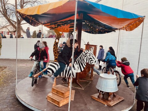 Das eigentliche Highlight dieses Jahr war das vor dem Pfarreizentrum aufgestellte Karussell, welches die Minis mit grosser Freude, aber auch Verwunderung, bestiegen. Schnell bildete sich eine aus Jung und Alt bestehende Schlange vor diesem im digitalen Zeitalter etwas museal anmutenden Technikwunder, welches mit der Pedalo-Kraft der zwei Velos angetrieben wird. Nach dem anschliessenden Mittagessen im Pfarreizentrum ging es los mit einem Filmdreh im Rahmen eines Wettbewerbs. Wir sind jetzt schon auf die Ergebnisse dieses Projektes sehr gespannt.
