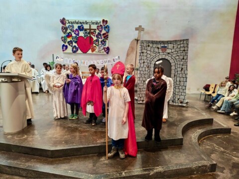 Am Sonntag, 9. November, durften wir in der voll besetzten St. Martin Kirche das Fest unseres Kirchenpatrons Martin von Tours feiern. «Warum feiern wir Sankt Martin?», fragte eine Schülerin zu Beginn des bereits mit grosser Spannung erwarteten St. Martins Spiels. Ja, warum feiern wir auch heute noch einen ehemaligen römischen Soldaten und späteren Bischof und Mönch, der bereits seit mehr als 1600 Jahren tot ist? Die Schülerinnen und Schüler der zweiten Klasse gaben in kreativ-spielerischer Weise und mit beeindruckendem Engagement unter der Leitung von Pascale Lenzin, Barbara Herzog und Bruno Curty die Antwort auf diese Frage.