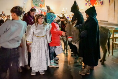Und klar, auch dieses Jahr besuchte uns als Höhepunkt des Adventsnachmittags ein besonderer Gast, der Samichlaus mit den drei Schmutzlis und sogar zwei echten Eseln, dem Cherry und Johny. Mit überschwänglicher Freude wurde er von 4 Engelinnen angekündigt, bevor er die Kirche mit seiner Begleitung betrat.