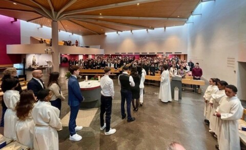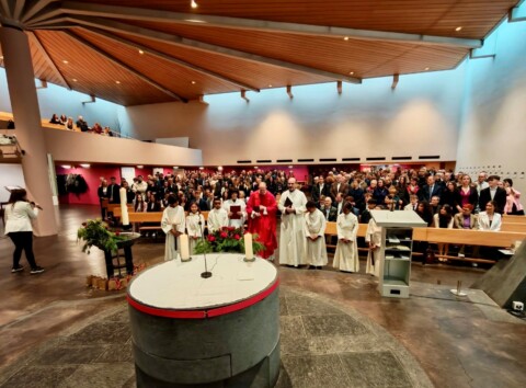 Am Sonntag, 16. November um 10.15 Uhr empfingen 18 junge Menschen aus unserer Pfarrei in einer eindrücklichen Feier das Sakrament der Firmung durch den Domherr Dr. Peter Schmid. Die Firmanden haben sich nicht nur mit grossem Engagement in die Vorbereitung der Gottesdienstfeier eingebracht. Auf beeindruckende und jugendlich entspannte Art und Weise waren sie als Lektorinnen und Lektoren aktiv beteiligt an der Gestaltung der Firmfeier. Musikalisch und gesanglich wurde die Feier, von der ehemaligen ESC Schweiz Vertreterin (1998 in Birmingham) Gunvor Meyer (ehemals Guggisberg) und ihrem Mann Roland Meyer begleitet. Ihr stilistisch breites Repertoire, das von Skyfall (James Bond) über Leonard Cohens Hallelujah bis hin zum Gospelklassiker Oh happy Day reichte begeisterte Jung und Alt.