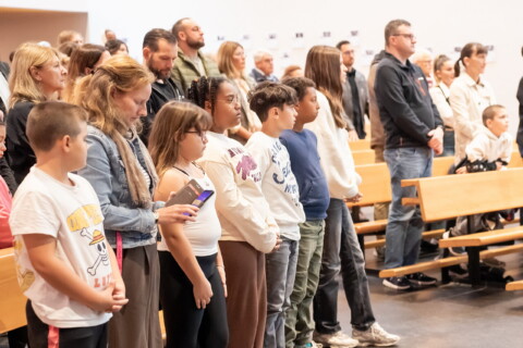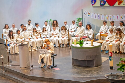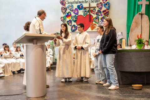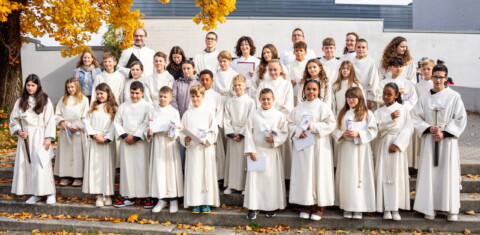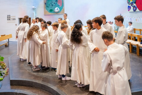 In einem festlichen Gottesdienst am Sonntag, 19. Oktober, um 10.15 Uhr wurden mit grosser Freude und Dankbarkeit 12 neue Minis in die St. Martins Mini-Schar aufgenommen. Joysi, Devin, Mihir, Josef, Mattia, Lulia, Naisha, Jonas, Noela, Amélie, Noel und Henry wurden einzeln beim Namen aufgerufen, um nach vorne zum Altar zu kommen. Stellvertretend für alle neuen Minis wurde ein Gebet gesprochen, den Mini-Dienst mit Freude zu erfüllen. Anschliessend kleideten 12 bisherige Minis die neuen ein, und sie empfingen den Segen. Reichlich beschenkt nahmen sie nun als Teil der Schar im Altarraum Platz, um der musikalischen Überraschung, dem Gitarrenspiel des älteren Ministranten Luis Herzog, zu lauschen. Er widmete seinen musikalischen Beitrag den 12 neuen Minis, zu denen auch sein Bruder gehört.